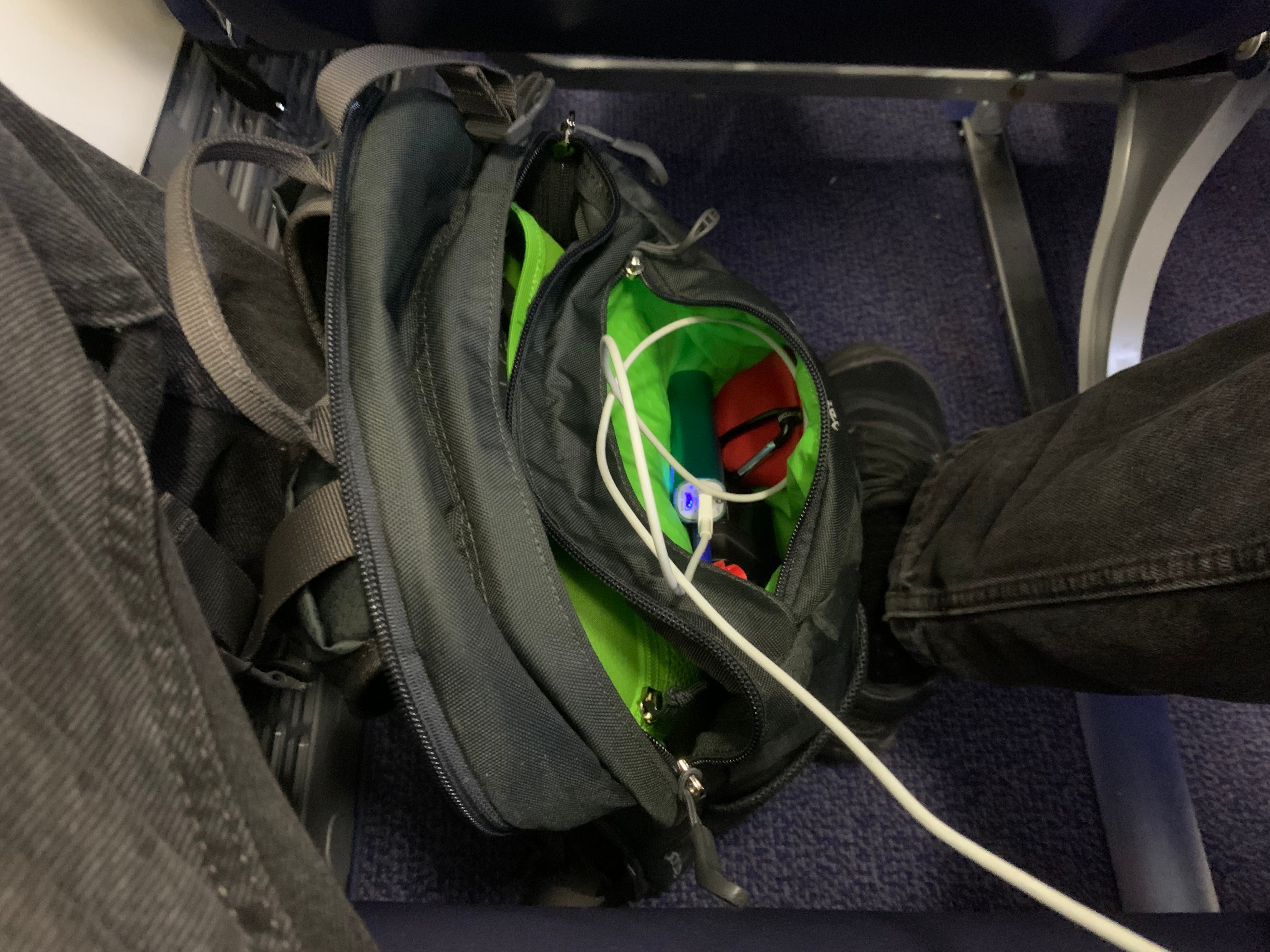 Photo ©2022 William L. Brown. Carry-on bag at my airplane seat. I’m charging my phone from a power bank. Probably because plane didn’t have outlets. That would be a frill.